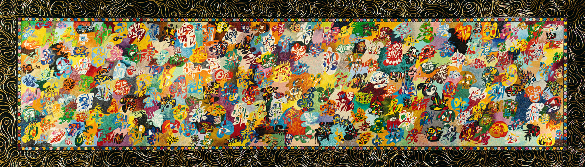 Divine DNA spricht die Betrachter sowohl auf intellektueller als auch auf wahrnehmender Ebene an. Ihre monumentale Größe und dichte Komposition wecken Ehrfurcht und Nachdenklichkeit, während die komplexen, nicht repetitiven Symbole zu genauer Beobachtung einladen. Das Wechselspiel zwischen Ganzheit und Detail erzeugt ein dynamisches Seherlebnis und spiegelt das Nebeneinander von Einheit und Vielfalt wider.